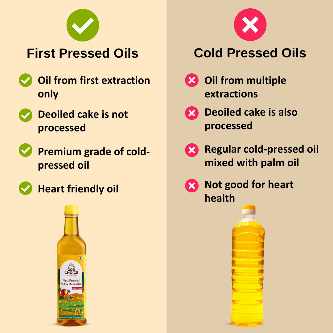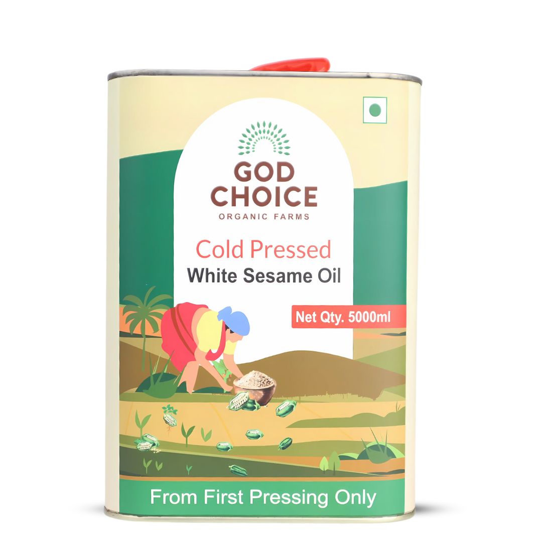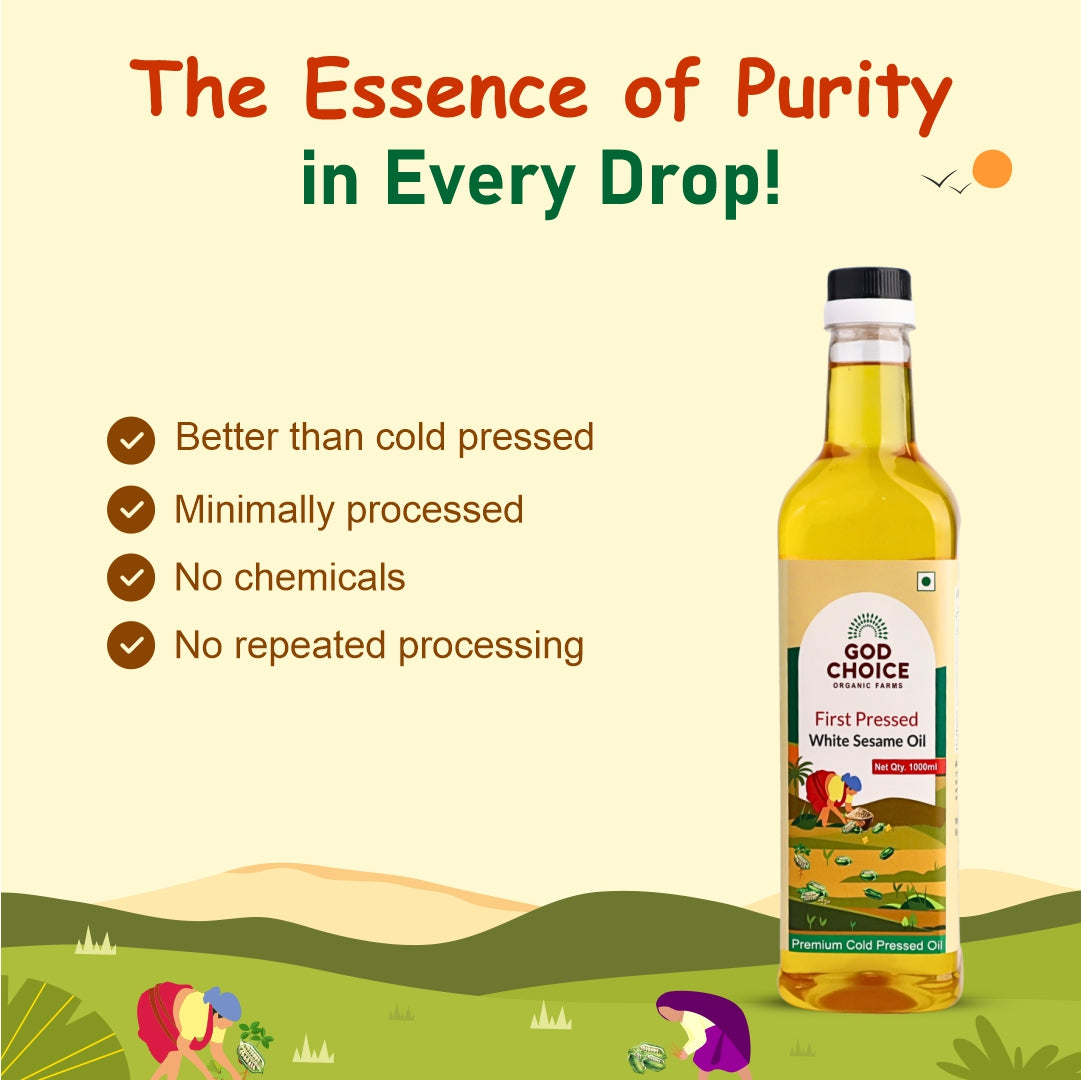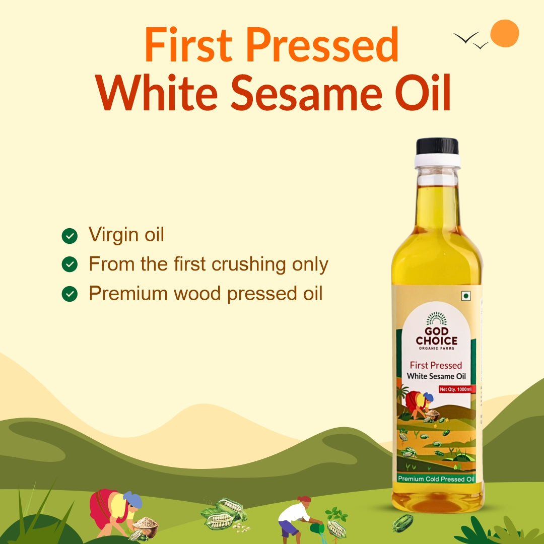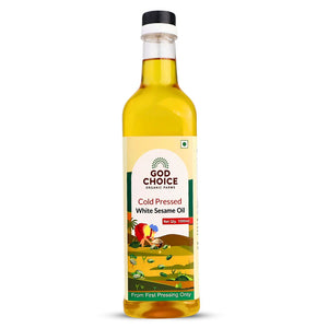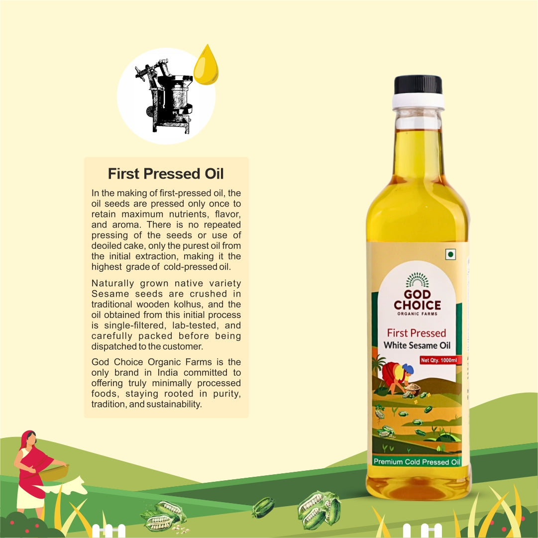 First Pressed White Sesame Oil is made by pressing native white sesame seeds only once in traditional wooden kolhus (kachhi ghani), ensuring maximum retention of nutrients, antioxidants, flavour, and aroma. Unlike regular "cold-pressed oils" that are extracted multiple times, this pure first-pressed oil is never reprocessed, making it richer and more heart-healthy. Repeated reheating of oil reduces its nutritional value and may harm cardiovascular health. Ours is only pressed once and used once at home, preserving its purity. Rich in Vitamin E, healthy fats, and natural antioxidants, this oil supports heart health, nourishes skin, strengthens hair, and boosts wellness. At God Choice Organic Farms, we are committed to purity, tradition, and sustainability,y bringing you the cleanest, most authentic sesame oil possible.